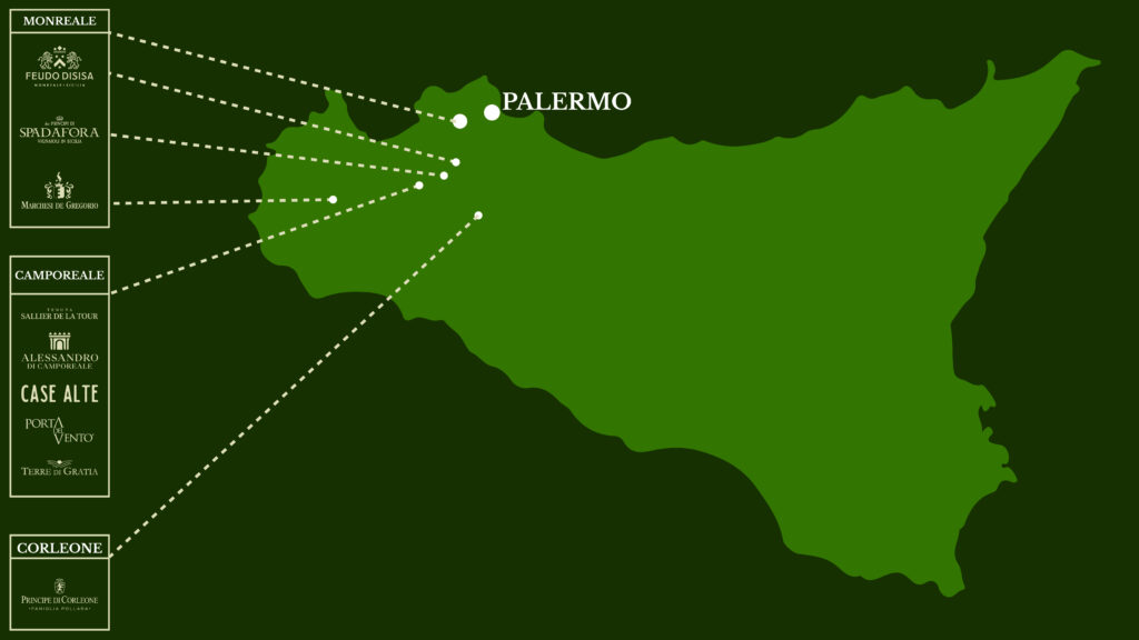 La zona di produzione della DOC (tra le più estese denominazioni della Sicilia) è localizzata in parte della provincia di Palermo e comprende il territorio dei comuni di Monreale, Piana degli Albanesi, Camporeale, San Giuseppe Jato, San Cipirello, Santa Cristina Gela, Corleone e Roccamena. Un’estensione davvero ampia che fa parte di quello che un tempo era il potente Arcivescovado di Monreale che, in epoche successive, è stato il centro focale per la cultura contadina, capace anche di aderire alla nascita dei Fasci siciliani e dar vita alla riforma agraria. Un areale che racchiude oggi otto cantine, offrendo un’importante diversità in termini di vigneti e suoli, suddivisi in tre macro aree: corleonese, area di Camporeale e Valle dello Jato.